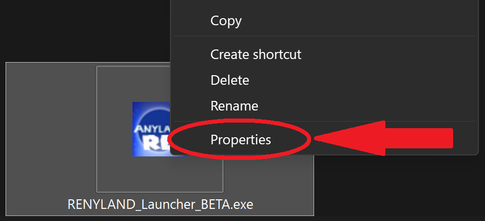 Right-click on the REnyland_Launcher application, then select Properties.