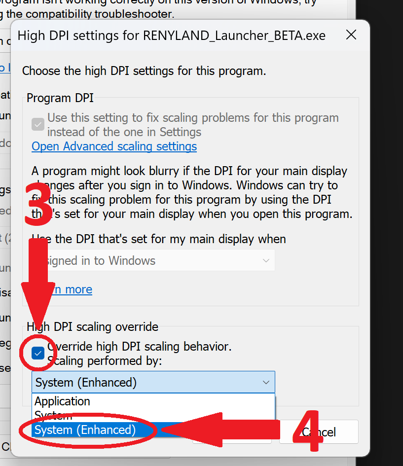 Check the option Override high DPI scaling behavior and select System (Enhanced).